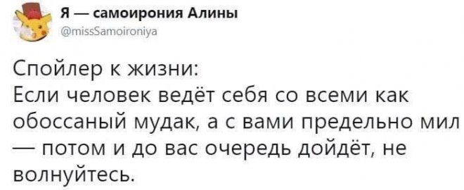 2023-05-09 11:16:26 @pressa.tv в Картинки с надписями Юмор из соцсетей Авторские шутки и комментарии из социальных сетей мемы юмор смешные картинки картинки с надписями +109 Комментарии 0 Просмотров 48.5K Внимание! Комментарии нарушающие правила сайта, будут удалены Отправить Есть тут доктора? Что с пальцем? Съёмки нового сезона «Ходячих мертвецов» стартовали в Питере Видеокамера в скорлупе от грецкого ореха Как растет рис: Таймлапс 16 дней менее чем за минуту Как с помощью УФ-лампы обнаружить дефекты на кузове автомобиля В Китае в конфликте из-за парковочного места победили высокие технологии
