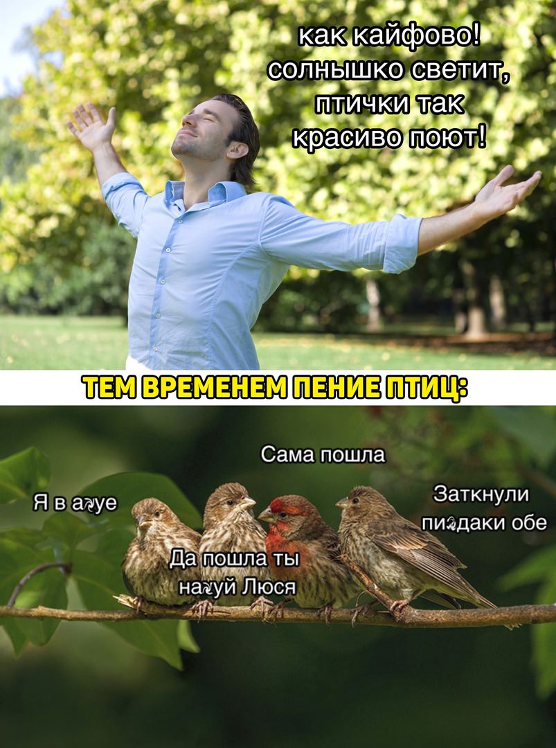 2023-05-15 10:46:47 @pressa.tv в Картинки с надписями Мемы и картинки Свежая порция смешных картинок поднимающих настроение мемы юмор смешные картинки картинки с надписями +106 Комментарии 3 Просмотров 44.4K Внимание! Комментарии нарушающие правила сайта, будут удалены Отправить Похотливый хорёк 15 мая 2023 13:09 0 Спасибо! Как раз забыл принять таблетку))) Ответить Vo1 15 мая 2023 15:10 +1 Большей частью пение свойственно самцам, а не самкам, хотя встречаются исключения. Ответить 01 15 мая 2023 22:26 0 Чисто мужская подборка, всё чётко и не каких соплей... Ответить Мужики решили попробовать сюрстрёмминг прямо в автомобиле В Дели количество вредных веществ в воздухе в 30 раз превышает нормы Домашний кролик стрессует на приеме у ветеринара Страшный сон брутального бородача Мужик нашел на дороге "ва-ва-ва" Русский магазин в Китае