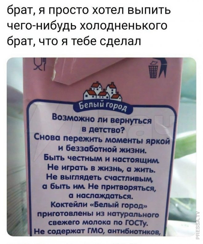 2023-09-20 10:44:05 @pressa.tv в Картинки с надписями Мемы и картинки Свежая порция картинок улучшающих настроение мемы юмор смешные картинки картинки с надписями +86 Комментарии 3 Просмотров 38.9K Внимание! Комментарии нарушающие правила сайта, будут удалены Отправить елена михайловна тихонова 20 сентября 2023 13:25 0 А что будет если выпить этот вд 40? Ответить Евгений 22 февраля 2024 13:04 0 Плохо будет. Это средство от ржавчины, им обычно заклинившие пассатижи обрабатывают, к примеру Ответить Руслан 20 сентября 2023 15:30 0 В мечтах мальчика мой выбор третья справа Ответить В Казахстане спасли влюблённую пару лебедей от смерти в замёрзшем озере Китайская очищающая масочка для сковородок Топ неожиданных концовок Психолог: заведите питомца и рассказывайте ему свои мысли и переживания Люди, будьте добрее Музыкальная минутка ностальгии