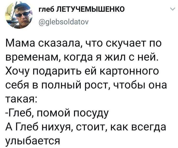 2025-05-16 12:42:21 @pressa.tv в Картинки с надписями Юмор из соцсетей Авторские шутки и комментарии из социальных сетей юмор из соцсетей смешные твиты скриншоты смешные комментарии мемы +102 Комментарии 1 Просмотров 51K Внимание! Комментарии нарушающие правила сайта, будут удалены Отправить Гость Гость 16 мая 2025 14:52 +2 Прикол с ребёнком у стоматолога был предсказан в книжке "А я был в компьютерном городе" 30-летней давности. Ответить Психолог: заведите питомца и рассказывайте ему свои мысли и переживания Кладоискатели Так выглядит японский метод упаковки подарков Юмор из соцсетей Когда в кафешке нет сдачи Парящая гирлянда стала главным новогодним трендом