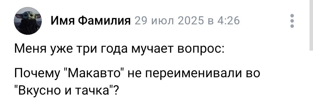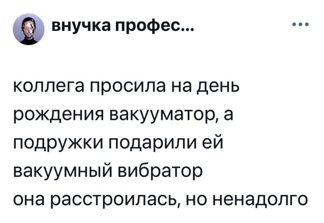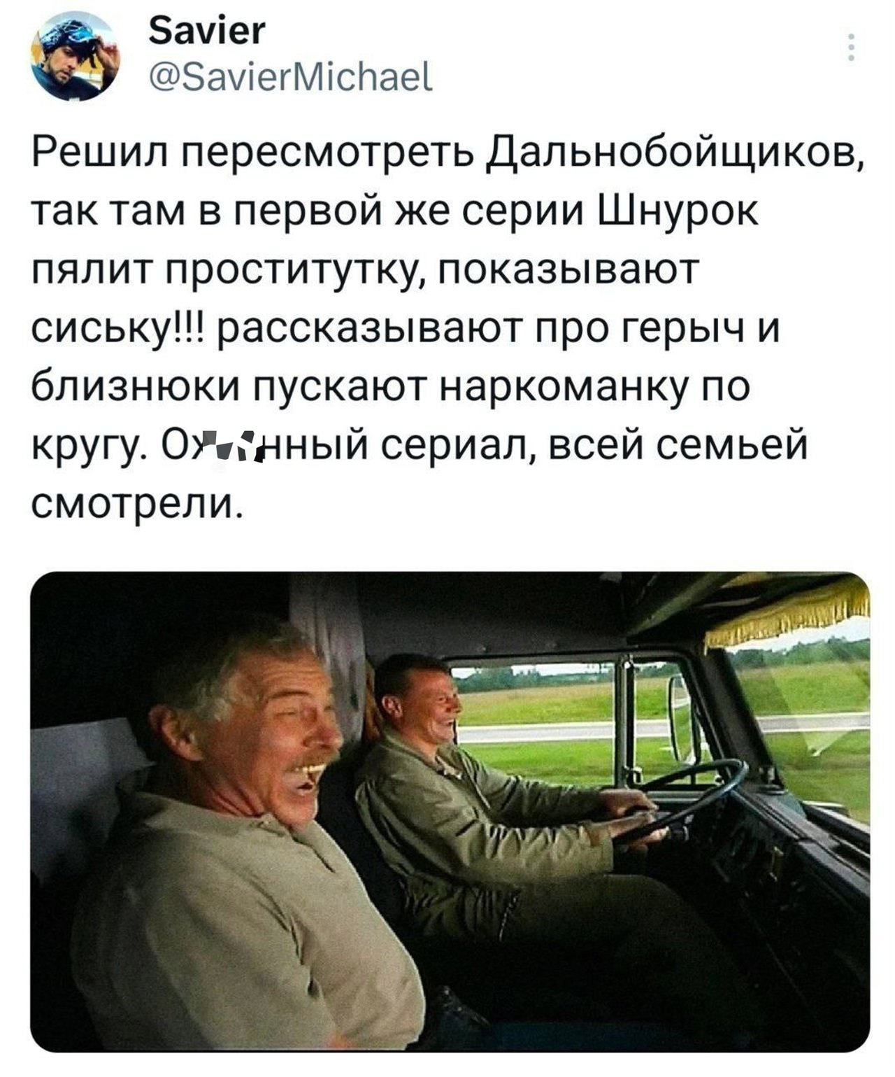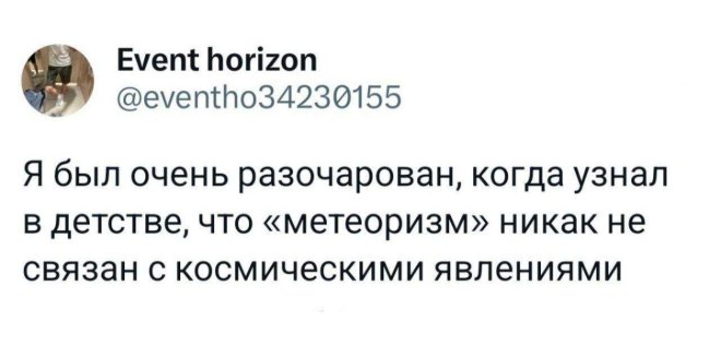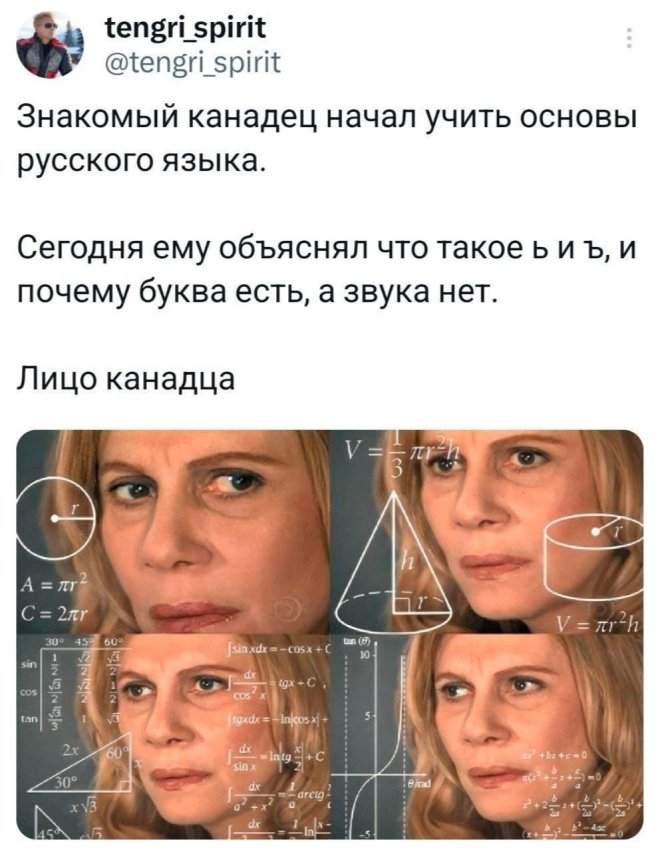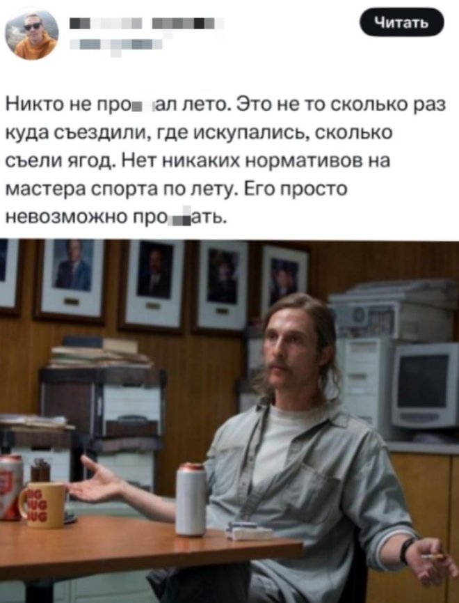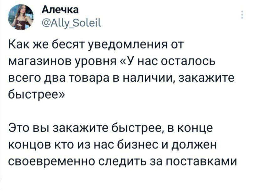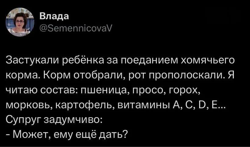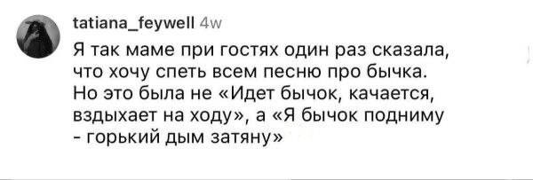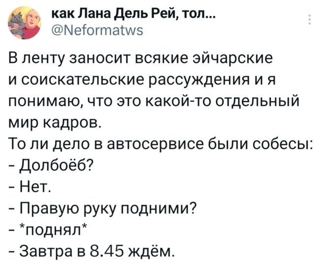 2025-08-05 11:48:47 @pressa.tv в Картинки с надписями Юмор из соцсетей Авторские шутки и комментарии из социальных сетей мемы юмор смешные картинки картинки с надписями юмор из соцсетей +117 Комментарии 0 Просмотров 52.2K Внимание! Комментарии нарушающие правила сайта, будут удалены Отправить Мемы и картинки Актерская игра 10 из 10 Юмор из соцсетей Мужик на старой девятке доехал из Казани в Марокко, преодолев 13 тысяч километров Минутка литературного юмора Чем больше сигналишь, тем дольше ждешь