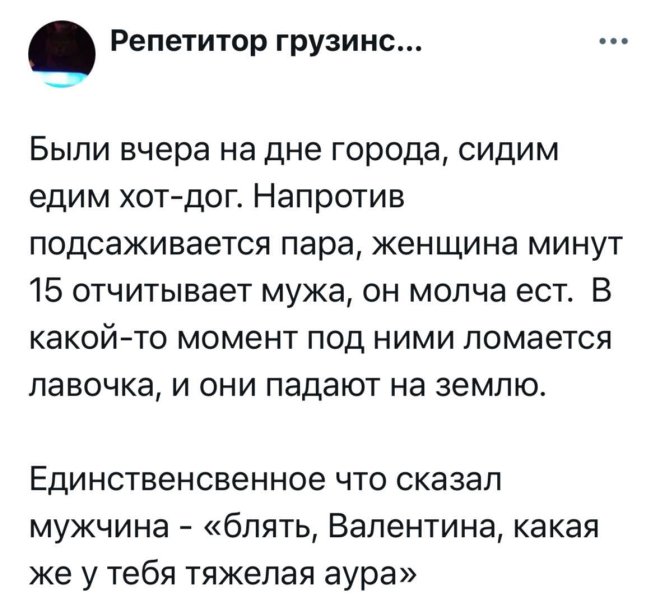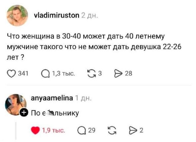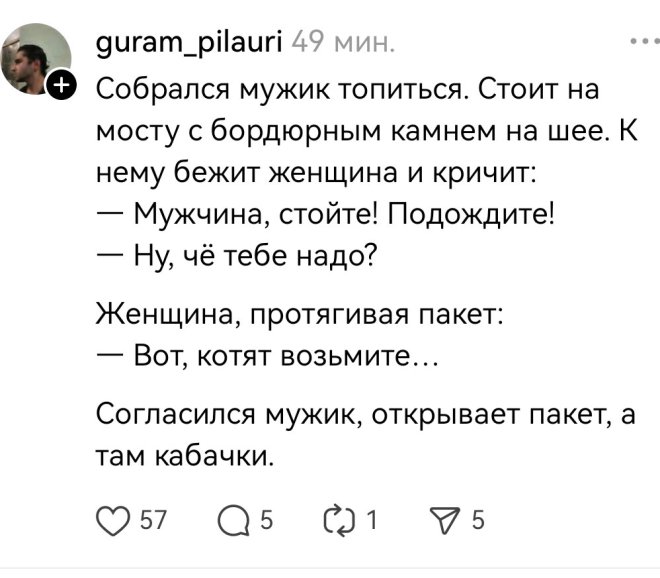 2025-09-26 09:48:48 @pressa.tv в Картинки с надписями Юмор из соцсетей Авторские шутки и комментарии из социальных сетей юмор из соцсетей скриншоты смешные твиты смешные комментарии картинки с надписями +118 Комментарии 0 Просмотров 43.9K Внимание! Комментарии нарушающие правила сайта, будут удалены Отправить Русский магазин в Китае Pontiac Bonneville 1964 года выпуска Случайные совпадения Съёмки нового сезона «Ходячих мертвецов» стартовали в Питере Мемы и картинки В Дубае планируют построить 580-метровый небоскрёб - Emirates Air Hotel с настоящим A380 на крыше