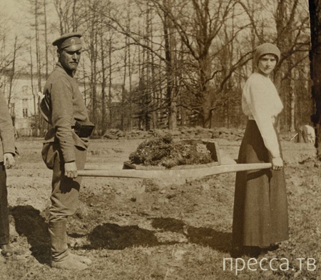 Великая Княжна Татьяна, дочь царя, переносит при помощи солдата, глыбы дерна на носилках. Фотография сделана в Царском Селе