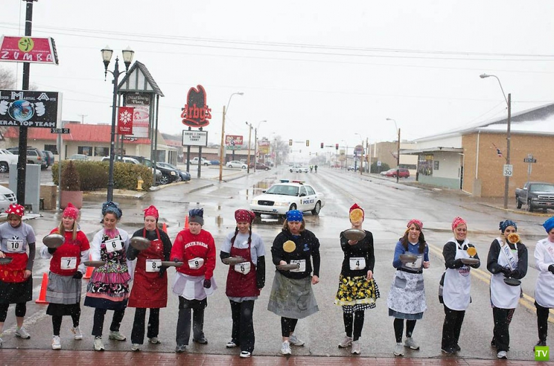 Участницы гонки в «День Блинов» бегут по улице, подкидывая блинчики в г. Либерал, штат Канзас. Это дружественное соревнование с городом Олни, Англия.