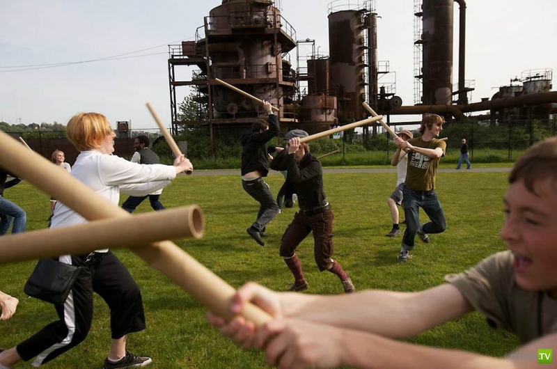 Участники Лиги Дуэлянтов на Картонных Трубках на «поле боя» в парке Gas Works Park в Сиэттле. Победитель получит выполненную по специальному заказу трубку.