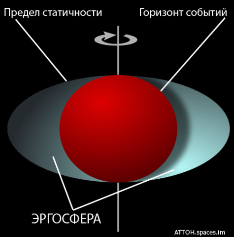 На определенном расстоянии вы окажетесь на границе фотонной сферы (эргосферы). Это область, где фотоны движутся по круговым орбитам. Если бы вы могли остановиться здесь (что невозможно из-за огромной гравитации), вы бы увидели собственный затылок, так как излучение, испущенное вами, огибает горизонт событий и возвращается к вам. Участок пространства-времени, находящийся в непосредственной близости от вращающейся чёрной дыры и заключённый между горизонтом событий и границей статической устойчивости.