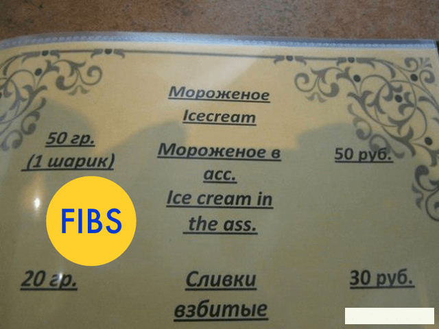 2. Название десерта в меню одного из сочинских заведений действительно переведено на английский как «ice cream in the ass» («мороженое в заду»)?