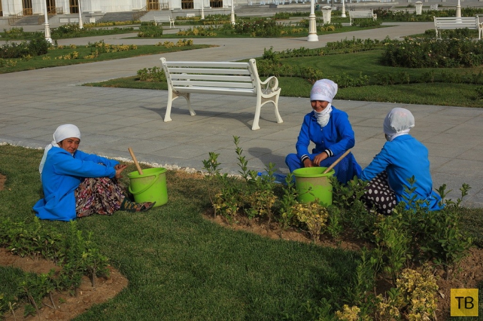 28. Работницы садово-паркового хозяйства. Если вы, прочитав про туркменские чудеса, уже собрались на ПМЖ в Туркмению, то учтите, что для иностранцев, желающих жениться на туркменках, установлен государственный калым в 50 тысяч долларов. Есть второй вариант получения гражданства — создание нового предприятия с обязательным набором какого-то количества туркмен на работу. Через несколько лет успешной деятельности предприятия можно получить вид на жительство и далее гражданство. Нетуркмену в стране ничего хорошего не светит. Равно как невозможно занять хоть какой-то значимый пост в руководстве страны, города и проч.