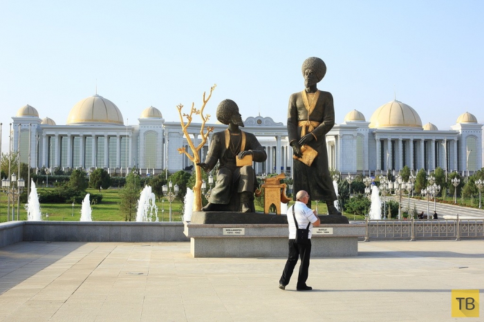 12. За последние годы построены невероятной красоты музеи, а по всему городу установлены сотни скульптур великих людей туркменского народа. Многие скульптуры покрыты золотом хотя бы частично. Только в этом месте 27 скульптурных групп и одна огромная, полностью позолоченная статуя Великого Туркменбаши Ниязова. Кстати, сзади на фото музей Ниязова, в котором собрано все о жизни великого первого секретаря компартии Туркменской ССР и подарки, которые он получал. А за моей спиной 118-метровый монумент Независимости Туркменистана. Он также частично покрыт золотом, а под самим монументом устроен музей, рассказывающий о становлении независимости великой Туркмении. Что забавно: государство действительно невероятно древнее, может быть, даже самое древнее в мире, но власть в нем менялась чуть ли не каждое столетие. От кого и когда они стали независимы, сказать трудно. Сейчас от России, а что будет через 50-100 лет, посмотрим. Пока все официальные делегации должны посетить монумент и возложить к его подножию цветы.
