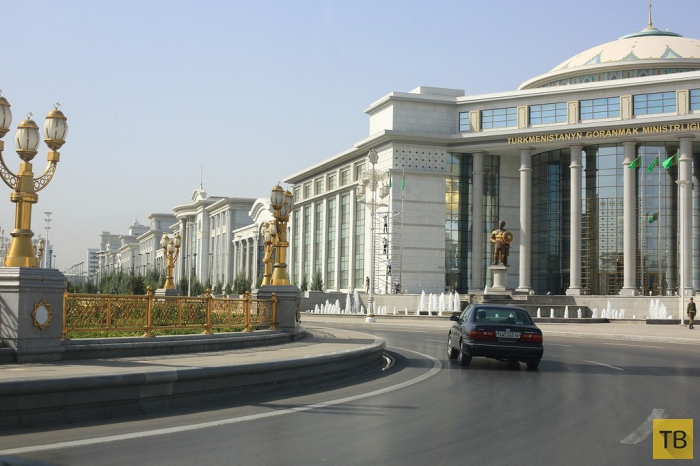 3. Обратите внимание на дорожное полотно, которое не плавится при +55. Фонари покрыты золотом. Почти все остальные фонари в городе, равно как и мусорные баки, перила — хромированные. Справа — министерство обороны. Туркмения — независимое государство, подчеркивающее свой нейтралитет. Но военных в городе очень много. Всего в армии служит 26 тысяч человек (население около 5 млн). Даже есть свой военно-морской флот на Каспии. Зачем такая армия — не знаю. Равно как и количество полиции. А еще невероятно раздутые штаты министерств и ведомств. В том числе экзотических. Например, есть министерство (ведомство) туркменского ковра или ахалтекинской породы лошадей. Скажем, в министерстве культуры и СМИ работает 800 человек! Понятное дело, что в министерстве работать престижнее, чем хлопок собирать или пасти верблюдов.
