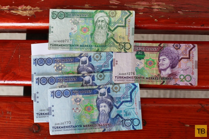 21. Вот эти пять бумажек я получил в обмен на купюру в 5000 рублей. Курс 13,5 рубля за манат. Рубли обменять можно только в банке, их нигде не принимают. Долларами можно расплатиться почти всюду, даже в обычном гастрономе. Правда, там курс будет довольно грабительский. Доллары в народе уважают, и, как правило, сбережения копят именно в долларах или евро. В долг также дают в иностранной валюте. Чем это вызвано, я не могу понять. Дело в том, что курс у них фиксированный и не менялся уже более 5 лет. Вообще не менялся. Ни на копейку.