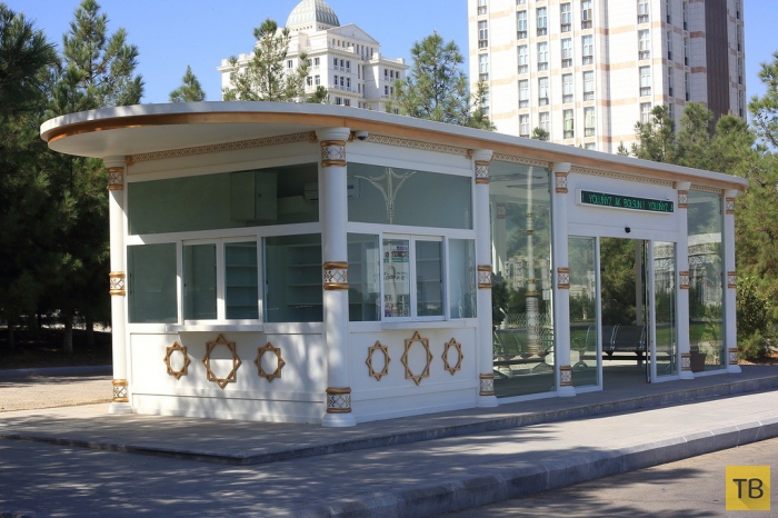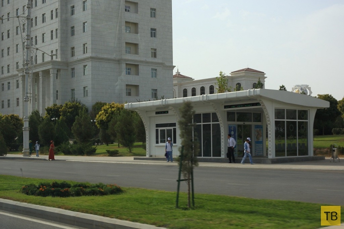 7. Как жить в таком климате, спросите вы? А вот так: все общественные здания и новые жилые дома строятся только с системой центрального кондиционирования. Нигде не встретится кондиционер на стене дома — всё внутри. На фото обычный жилой дом туркменской столицы. Это дом не для элиты. Тут живут самые разные люди, даже дворники. Строение на переднем плане — обычная остановка общественного транспорта. Она также с кондиционером внутри, огромной плазменной панелью, электронным табло расписания автобуса и цветами в горшках. Обратите внимание на хромированную мусорку справа. Кстати, весь гортранспорт в Туркмении бесплатен! Сел на автобус и хоть целый день катайся.
