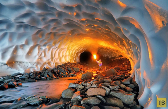 Внутри ледниковой пещеры на Аляске.