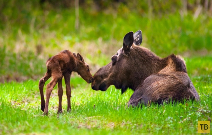 Лосиха и лосенок, только что родившийся.