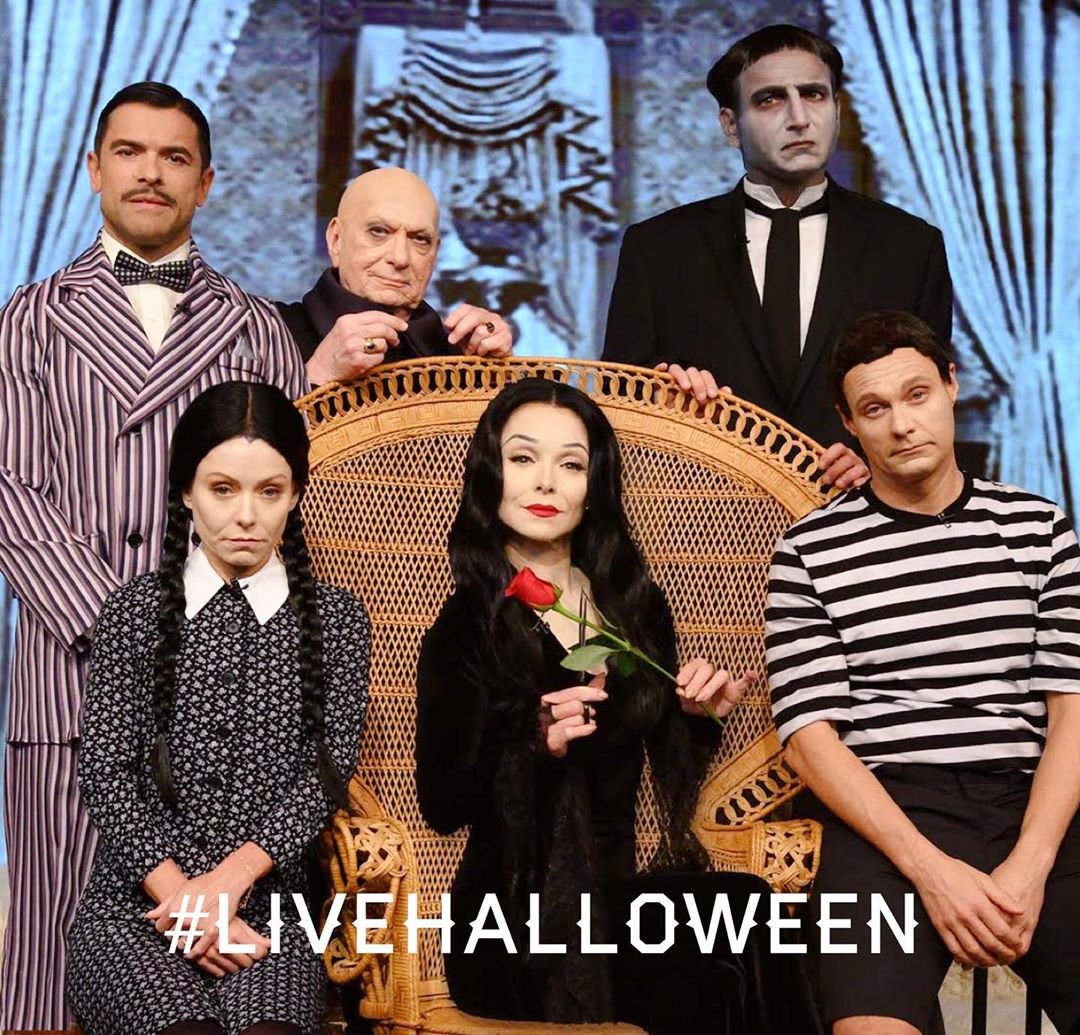 Келли Рипа со своим мужем Марком Консуэлосом в костюмах семьи Адамс в Instagram